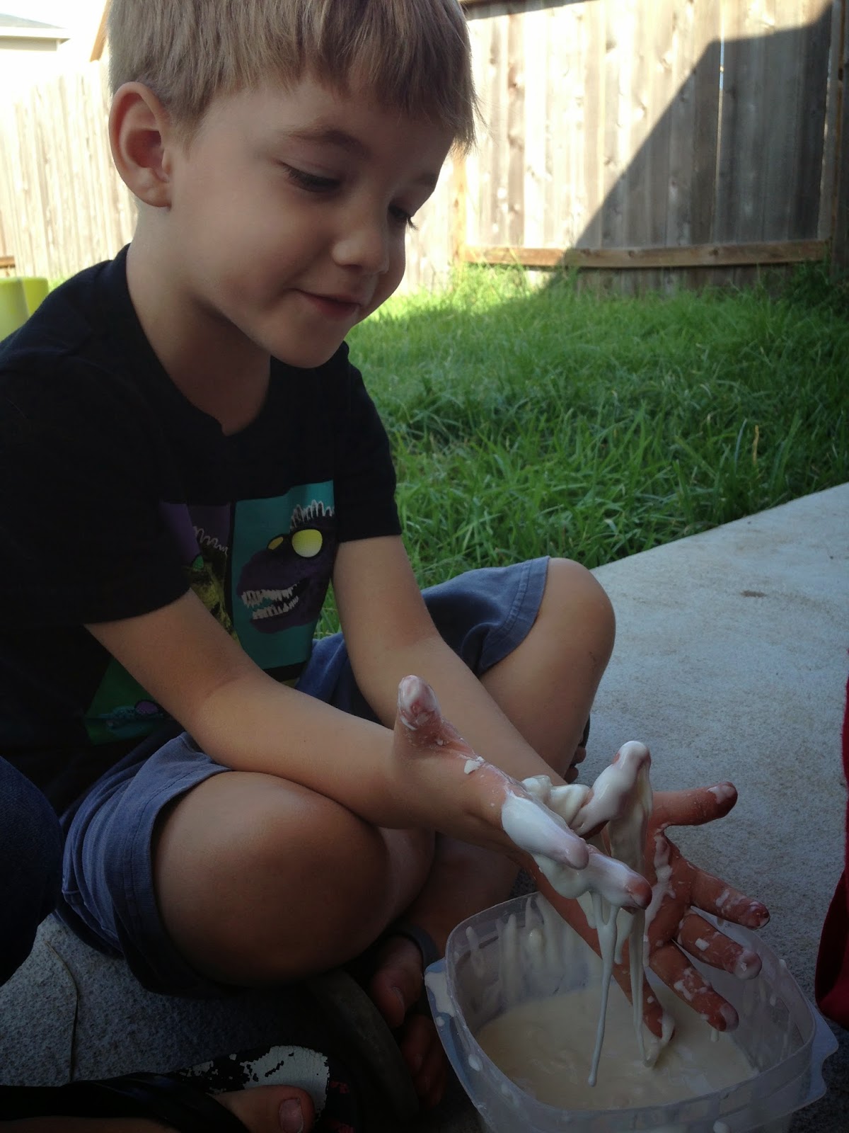 I made "moon goo" (which is cornstarch and water) for the kids to play with. It is a very strange sensory experience. If you move it quickly, you can roll it into a ball, but then if you stop moving it, it becomes liquid again and drips out of your hands... Everyone took a turn.